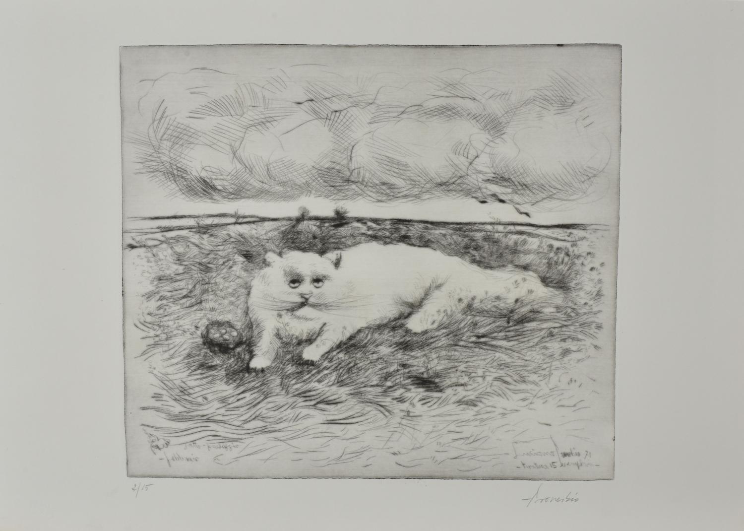 Luciano Proverbio GATTO CACCIATORE puntasecca su carta, cm 38x54 (lastra cm...