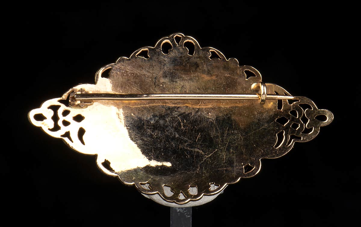 La spilla 4,5x2,5 cm; la pietra 2,2x1,5 cm