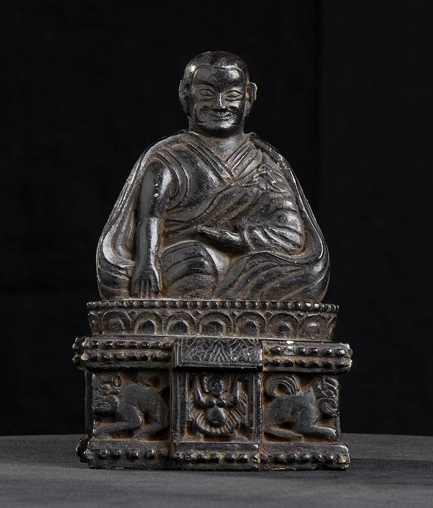 Il personaggio raffigurato potrebbe essere Phagmo Drupa Dorje Gyalpo (1110-1170), il primo monaco di una certa influenza nel monastero di Densatil, esponente della corrente Kagyu e famoso per l'importanza attribuita alla meditazione. Una scultura che lo ritrae, più antica ma iconograficamente vicina a questa, si trova nel Cleveland Museum of Art (D. Weldon – J. Casey Singer, The Sculptural Heritage of Tibet. Buddhist Art in the Nyingjei Collection, Londra 1999, p. 135, fig. 51).