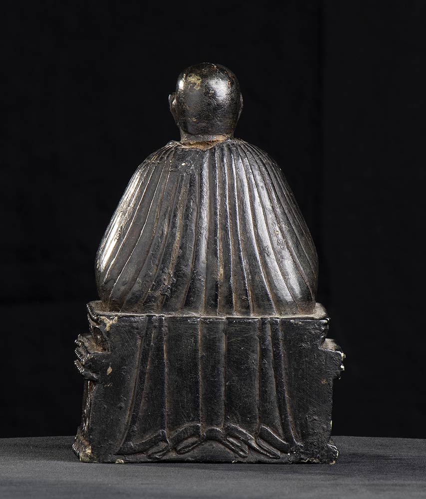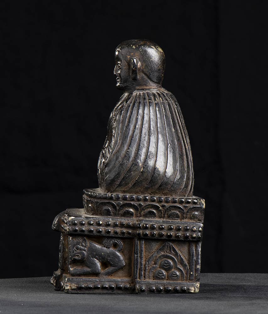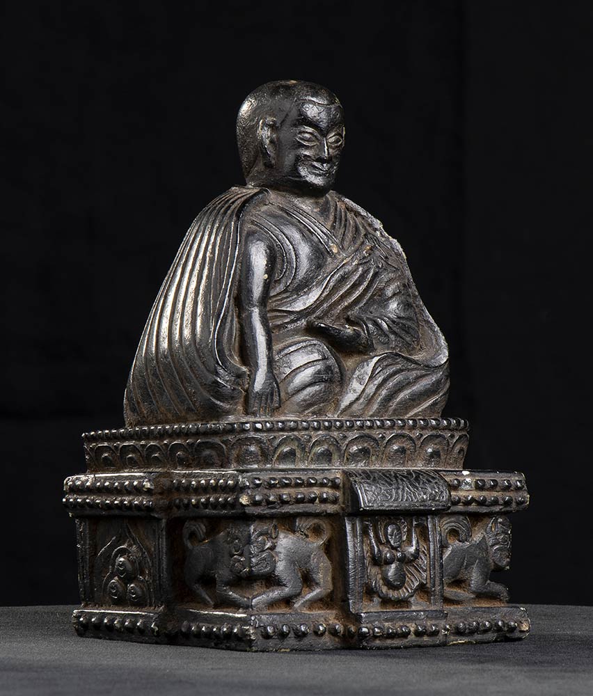 Il religioso raffigurato seduto su un basamento a sezione rettangolare decorato a rilievo su tre lati con figure e animali mitologici, vestito di ampio abito, il volto sorridente dal capo rasato.