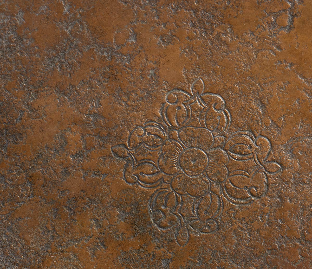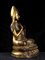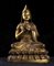 Seduto a gambe incrociate in posizione dhyanasana su base a doppio fiore di loto, le mani nel dharmachakra mudra, vestito di ampio abito con orli ravvivati da motivi floreali incisi, sulla testa un copricapo conico, l'espressione del volto rasserenante.