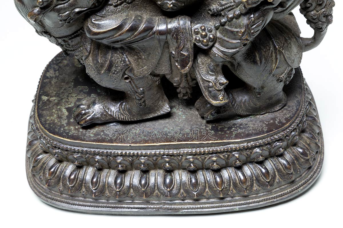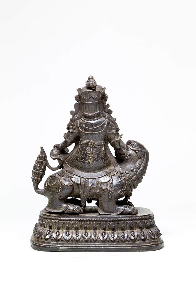 La divinità seduta in posizione lalitasana sul dorso di un leone su base a forma di doppio fiore di loto, vestito di una elaborata armatura e sul capo un'appariscente diadema, nella mano sinistra una mangusta, quella destra in origine a tenere l'asta di uno stendardo. Marchio apocrifo a sei caratteri di Yongle sul lato superiore della base.