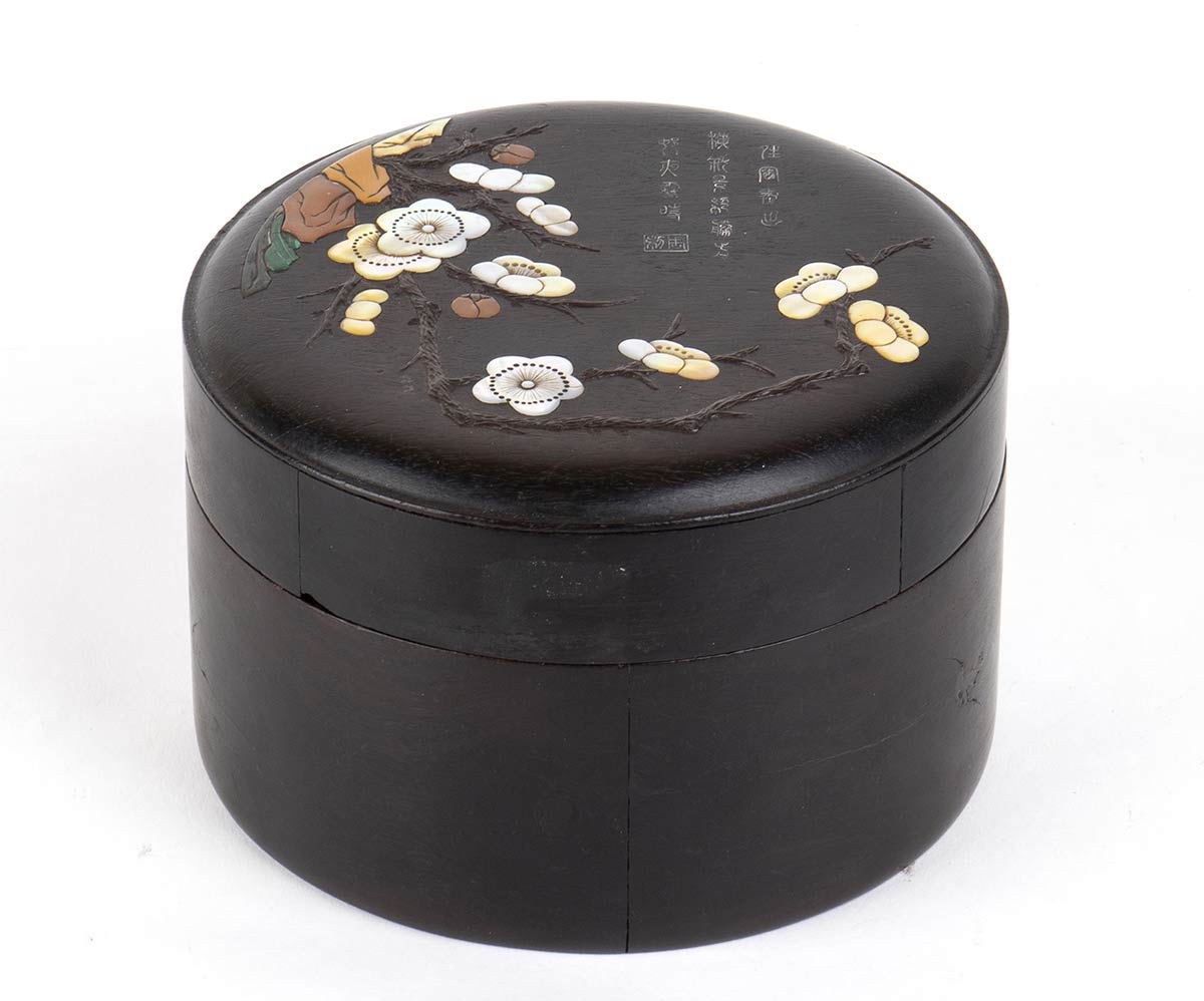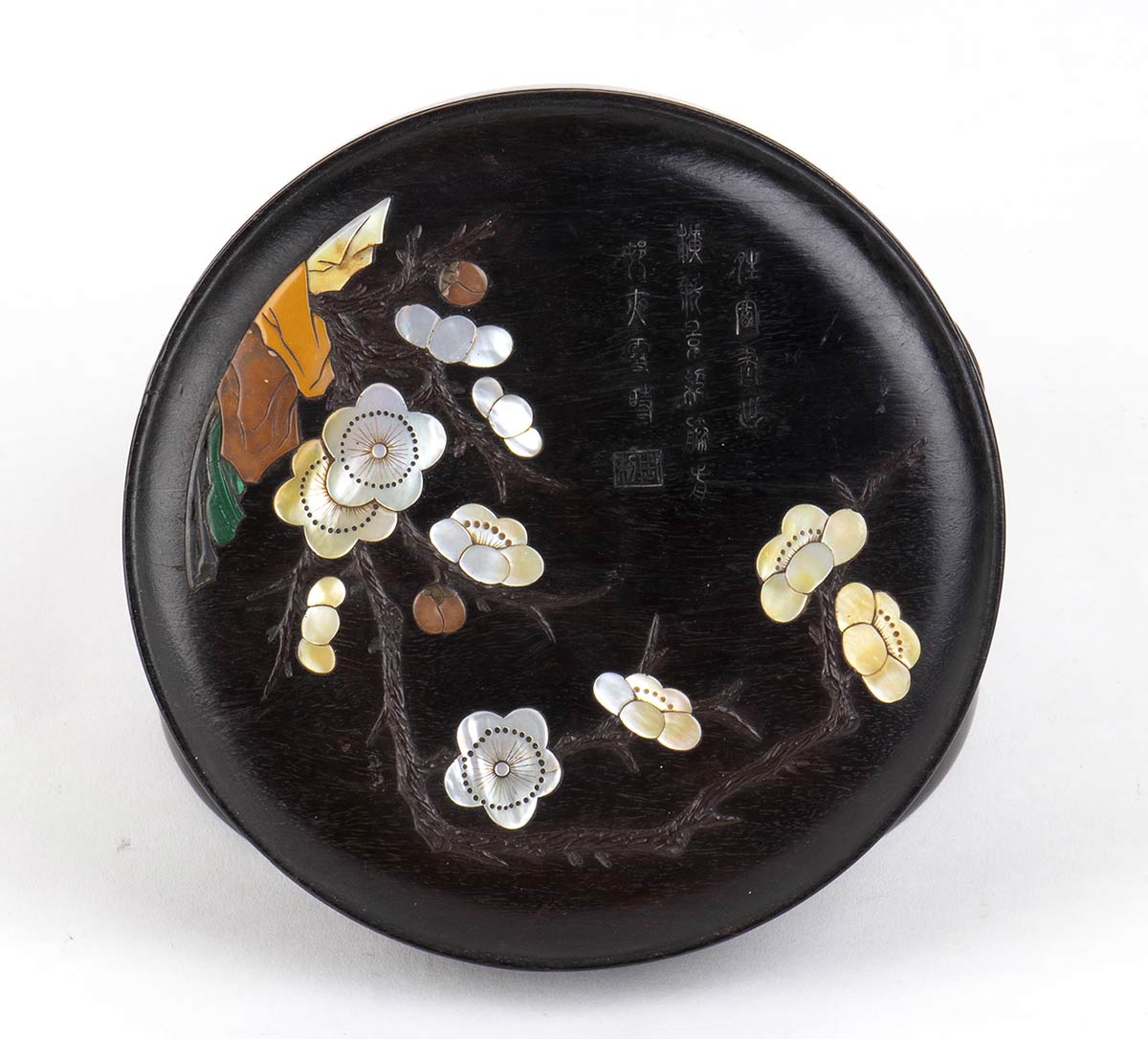 SCATOLA CON COPERCHIO IN LEGNO ZITAN CON INTARSIO DI MADREPERLA E PIETRE DURE<br>Cina, dinastia Qing