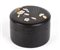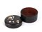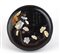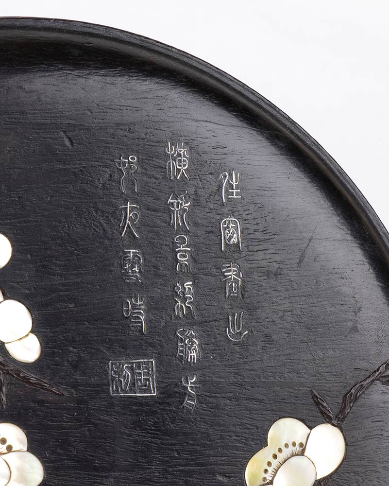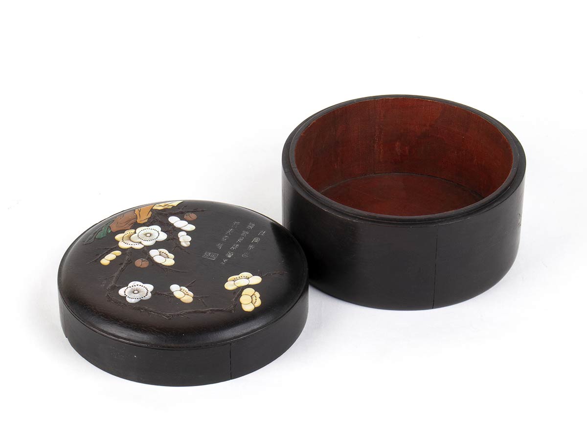 Di forma circolare, mostra sul coperchio una decorazione a intarsio di madreperla e pietre dure con un ramo fiorito e rocce, con iscrizione a filo di metallo.