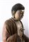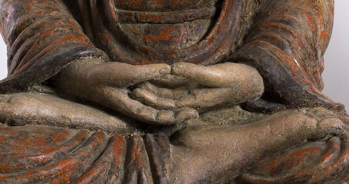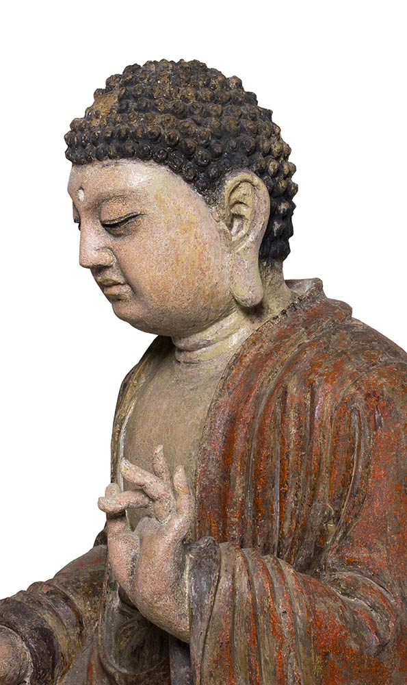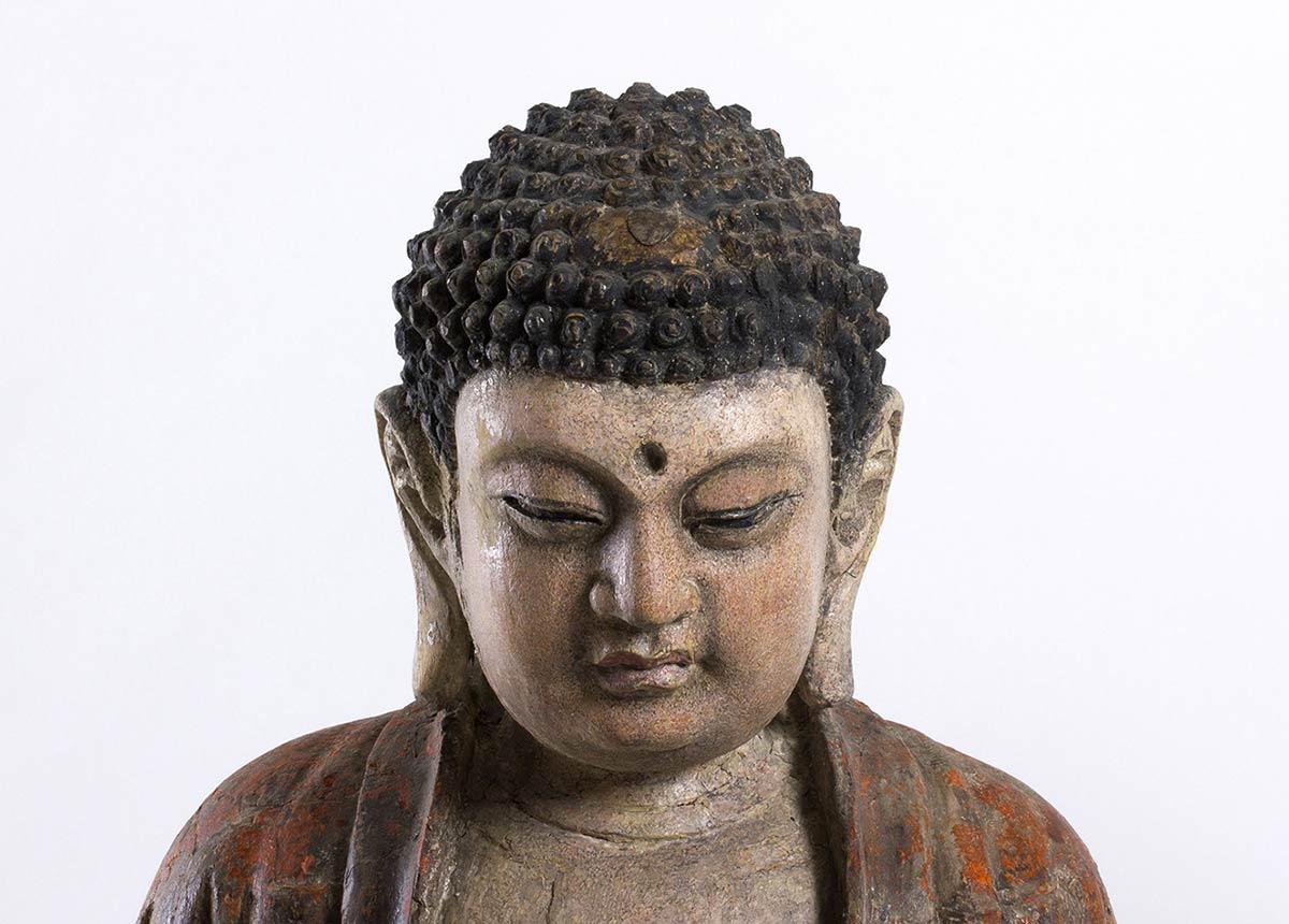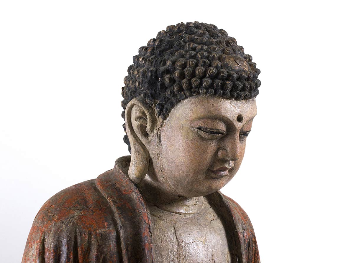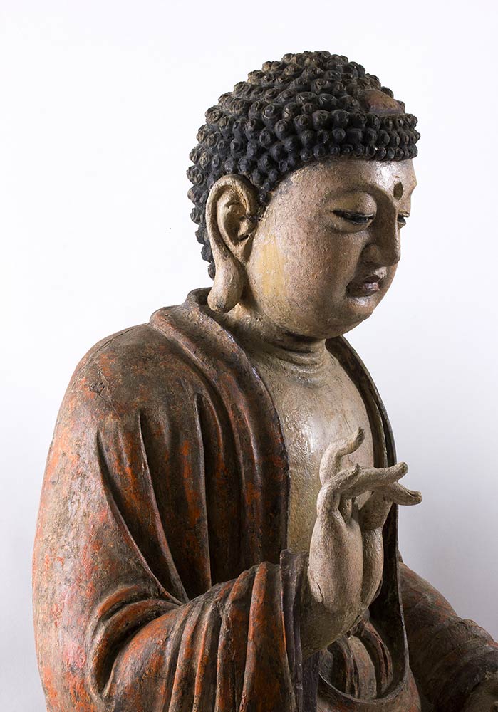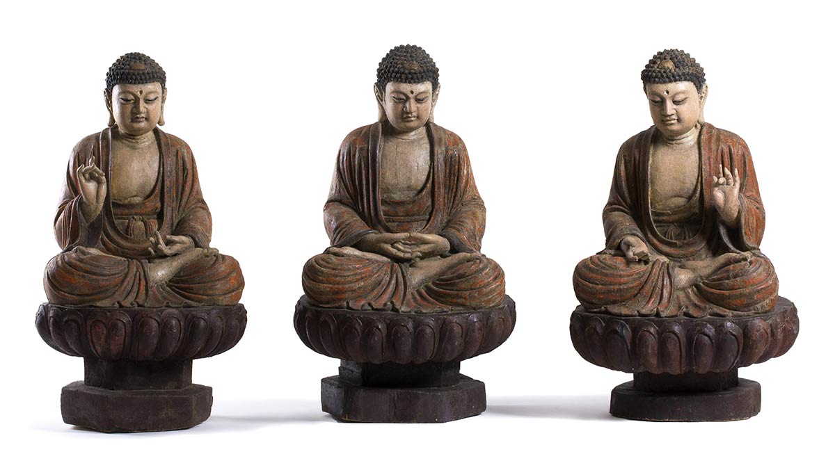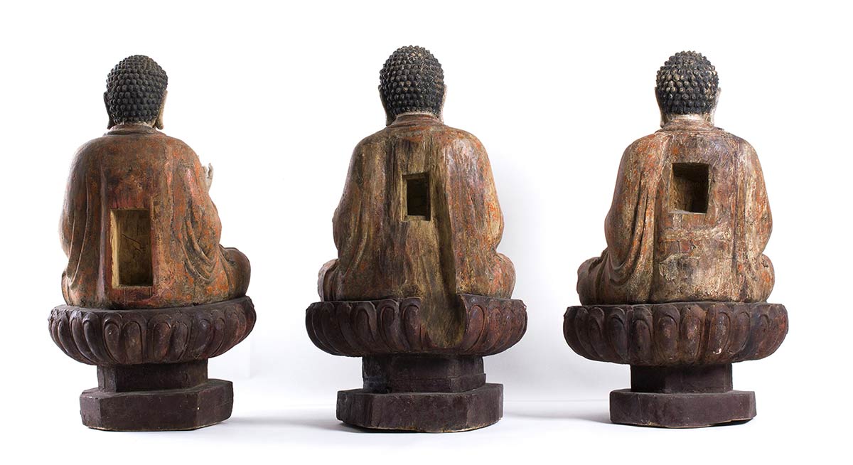 Le tre divinità tutte sedute in posizione dhyanasana su un piedistallo a forma di fiore di loto, una con le mani nel mudra dyana, le altre due con una mano nel mudra kurana e l’altra posata sul piede corrispondente e con il palmo aperto rivolto verso l’alto, ognuna vestita di ampia tunica allacciata appena sotto il petto che risulta parzialmente esposto, i volti con espressione serena e meditativa, l’urna al centro della fronte e i capelli riccioluti a circondare la protuberanza usnisa, le sculture dipinte e laccate in toni naturalistici, sul retro di tutte nicchia.