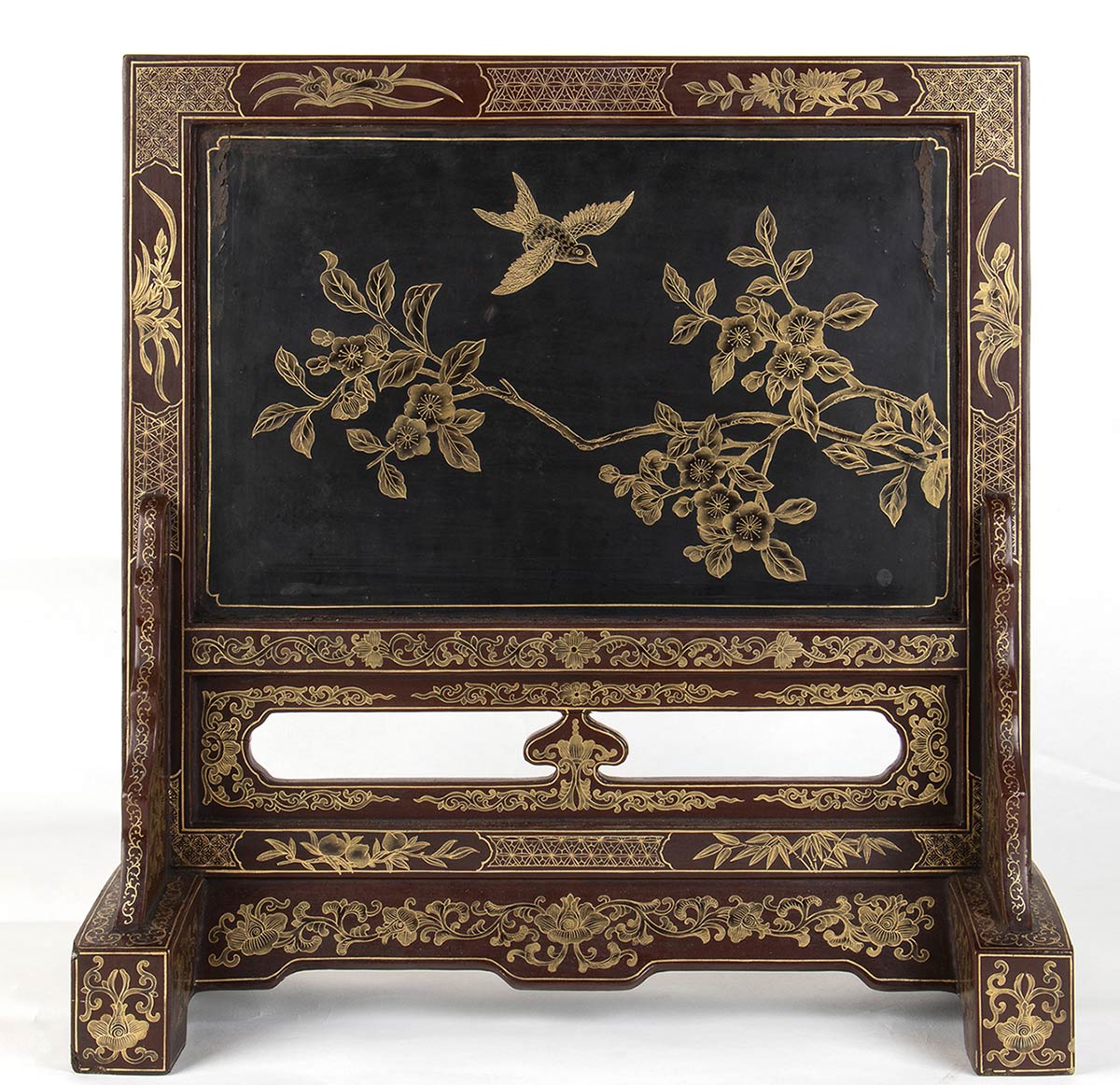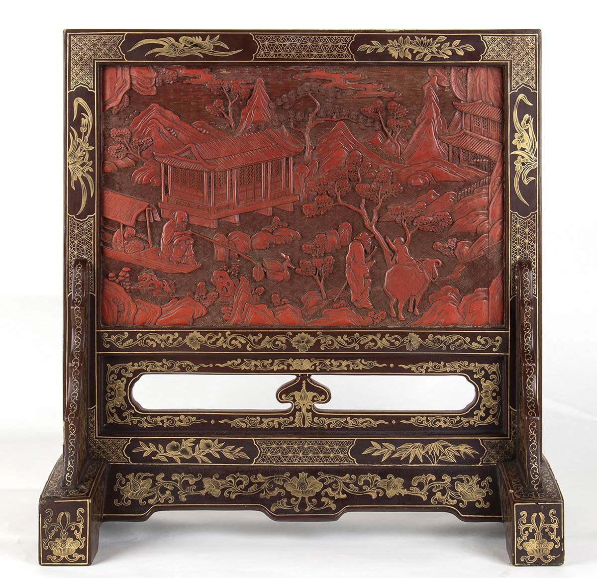 La cornice a fondo di lacca nera con minuto decoro a oro di motivi floreali e uccelli, la sezione centrale in lacca rossa intagliata con un paesaggio con rocce, padiglioni, alberi e figure.