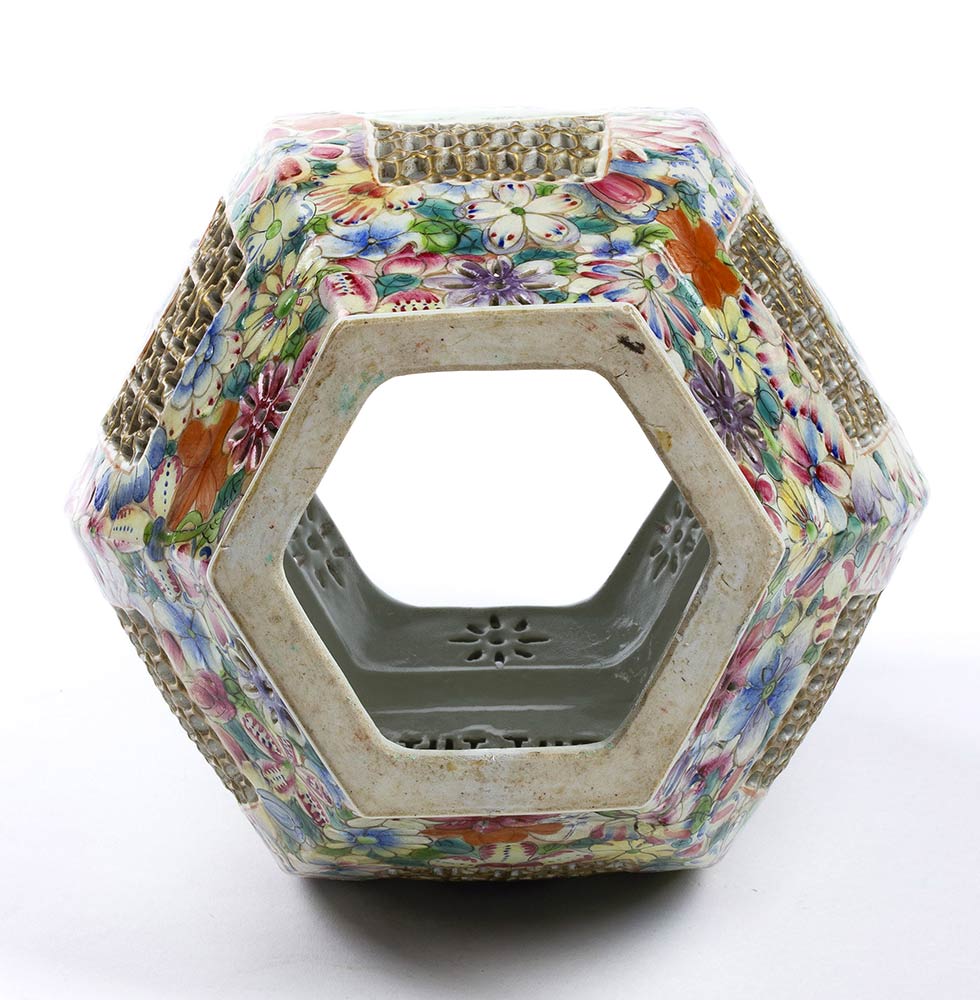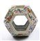 A sezione esagonale, il lato superiore con profilo mosso, l'intera superficie esterna smaltata in policromia con un fitto decoro di fiori sul quale si dispone per ognuno dei sei lati un pannello rettangolare lavorato 'a giorno' con un medaglione circolare al centro, ornato di composizione di 'fiori e uccelli' oppure di bambini che giocano, base in legno.