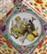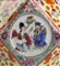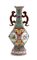 Posato su alto piede a sezione circolare, il corpo sagomato in una combinazione di pannelli triangolari e romboidali, il collo che si amplia fino all'orlo della bocca, due anse a forma di animale, l'intera superficie esterna dipinta in una ricca tavolozza policroma con motivi floreali, simboli di buon auspicio e medaglioni rotondi con figure.