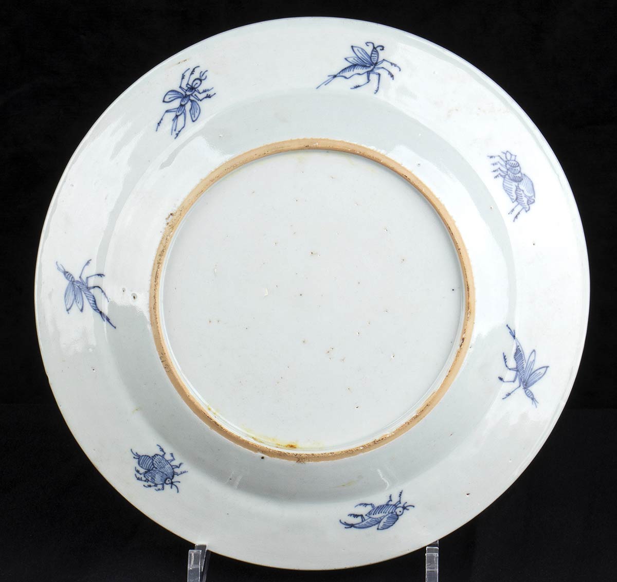 Sul fondo di tutti una scena con una dama nei pressi di uno stagno mentre si avvicina a un gruppo di uccelli, alle sue spalle un inserviente con un parasole, sulla tesa un fondo a cellette sul quale si dispongono otto cartigli, quattro con figure e quattro con uccelli, sul retro otto insetti delineati in blu.