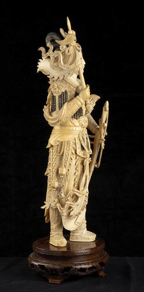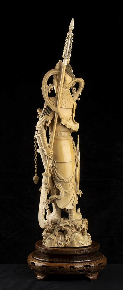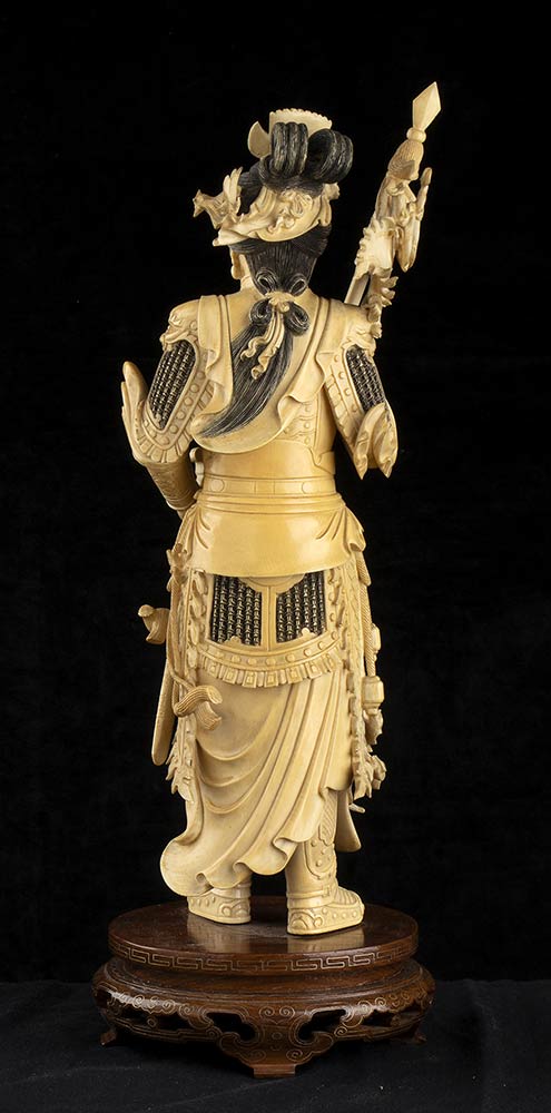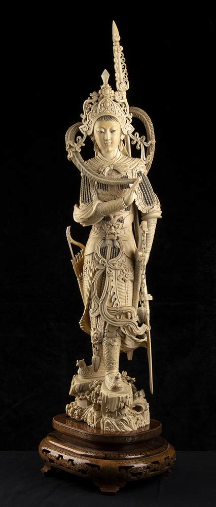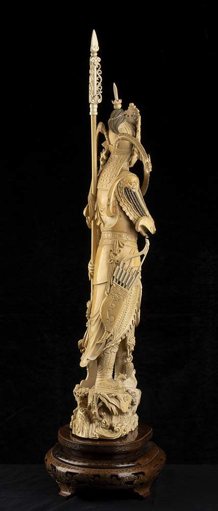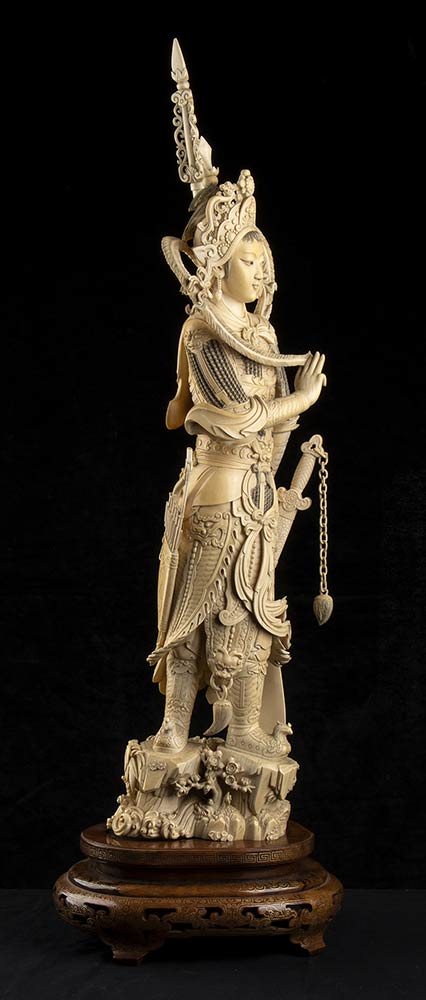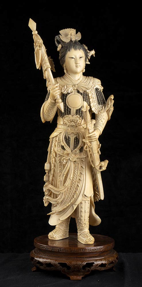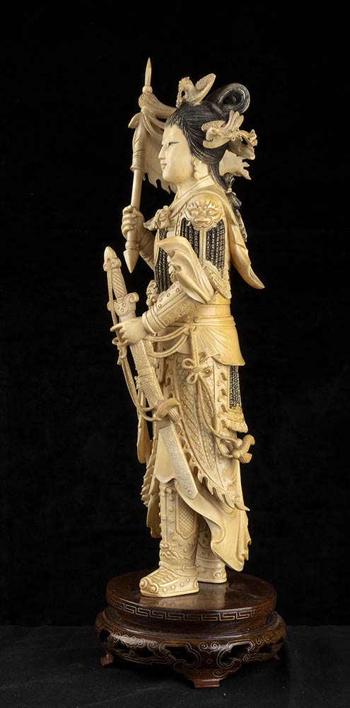 DUE SCULTURE DI FIGURE FEMMINILI IN ARMATURA IN AVORIO<br>Cina, inizio del XX secolo