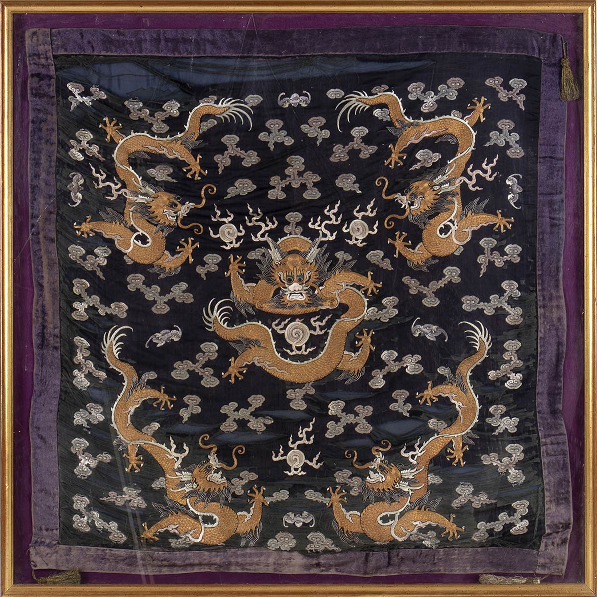 PANNELLO IN SETA CON DRAGO A RICAMO<br>Cina, XX secolo