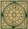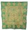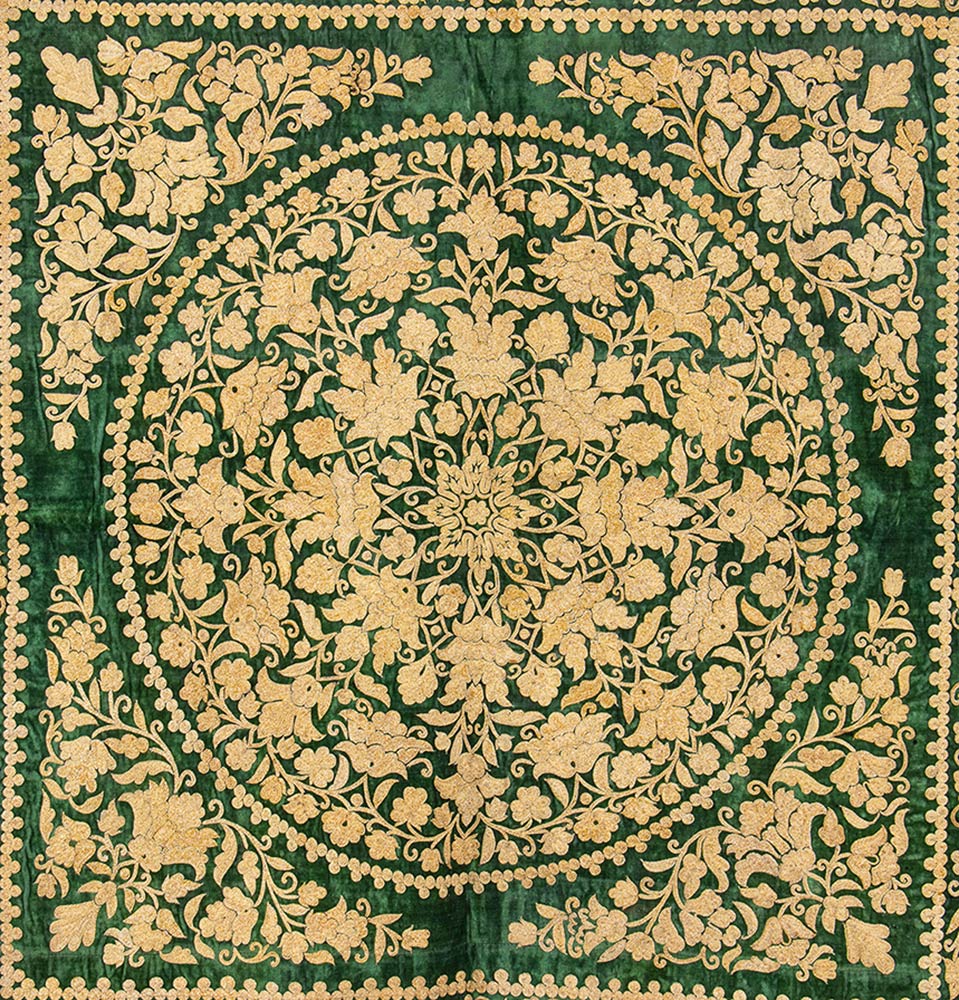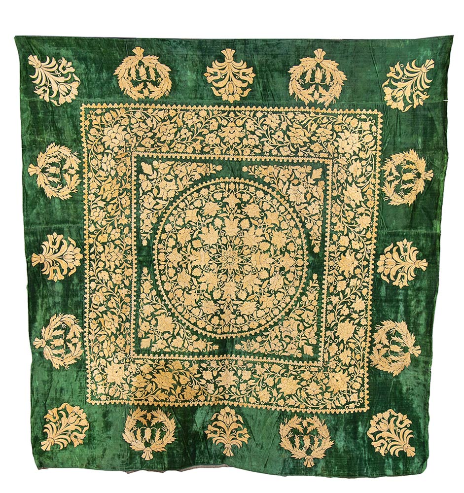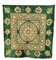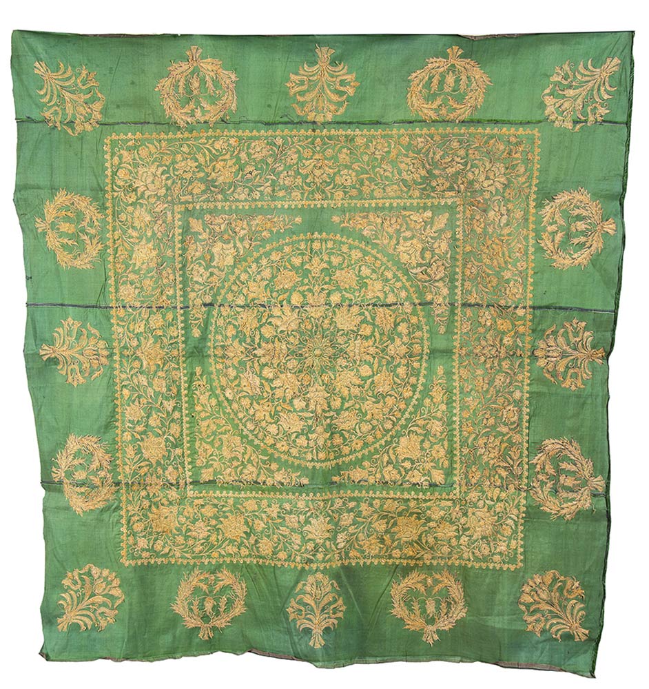 A fondo verde, presenta sulla superficie a vista un'elaborato a ricamo a filo giallo con motivi floreali, al centro un grande medaglione circolare entro cornice quadrata, lungo l'orlo una serie di gruppi di fiori e foglie.