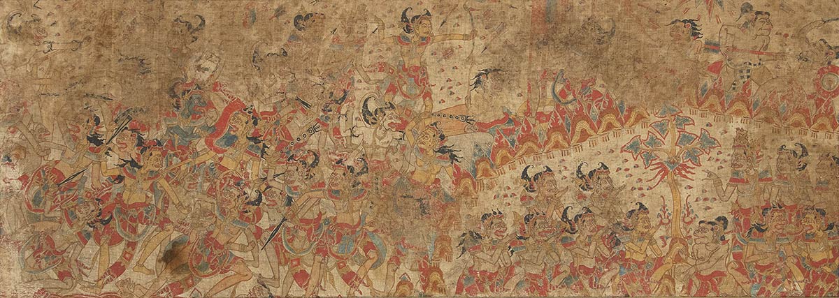 Dipinta nel tipico stile di Kamasan, la scena è con ogni probabilità ispirata dal Ramayana, il poema epico indiano che molta diffusione ebbe anche in Indonesia.