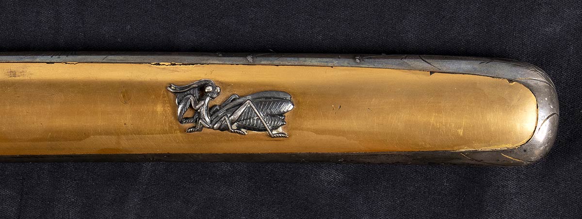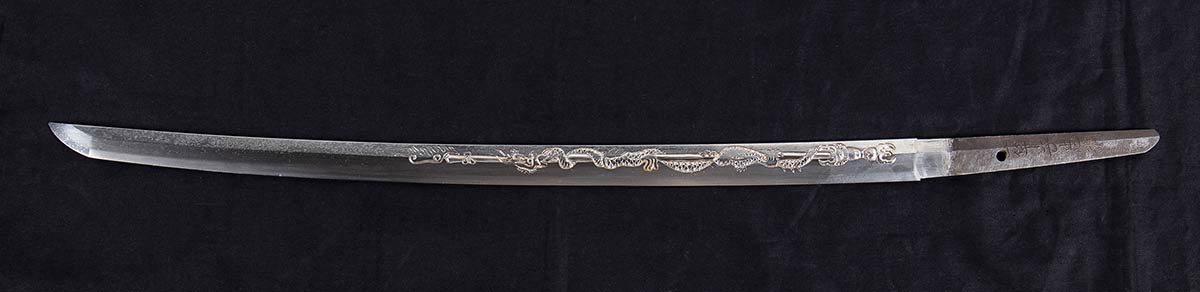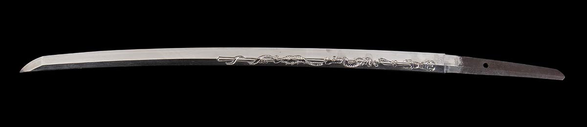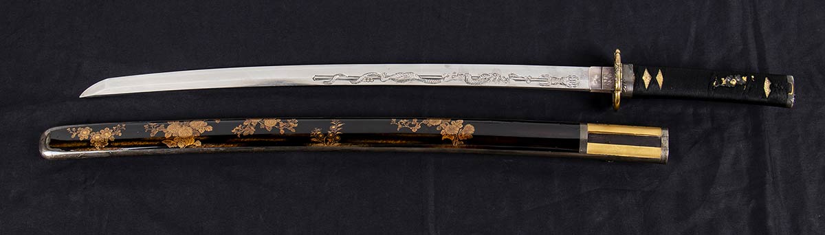 La lama ha su un lato un decoro di origini buddhiste di tipo kurikara, con un drago che attorciglia le sue spire intorno a un vajra. E' corredata di ricca montatura consistente in elsa tsuba quadrilobata in metallo parzialmente dorato con tralci di crisantemo a rilievo, impugnatura tsuka rivestita di pelle di pesce e treccia di filo di seta, menuki in metallo parzialmente dorato a forma di crisantemi, fuchi e kashira in metallo con fiori e un cinghiale tra le erbe autunnali, il fodero saya di tipo 'giorno e notte', da un lato a fondo di lacca nera con crisantemi a oro in maki-e, dall'altro a oro con applicazione in metallo a forma di mantide.