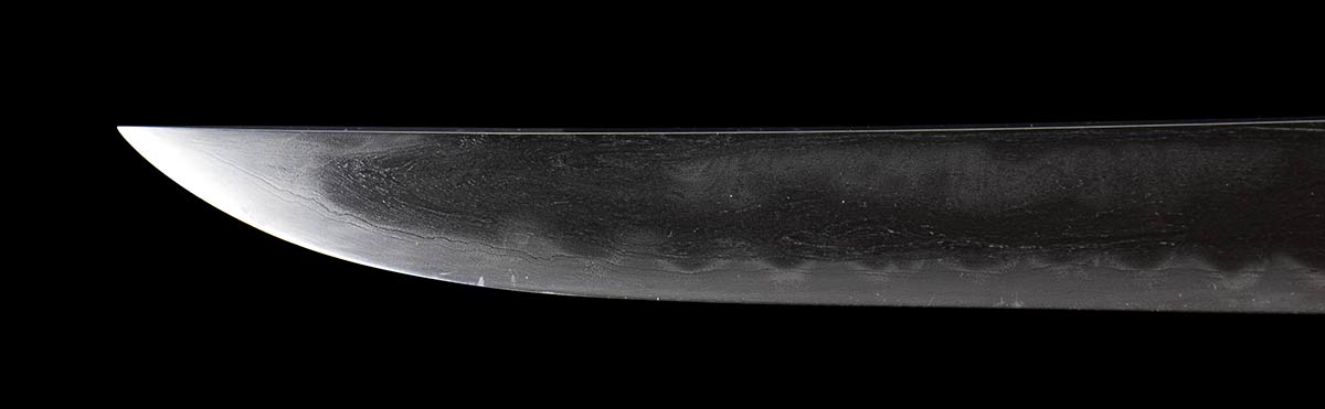 La lama è corredata di ricca montatura consistente in elsa tsuba all'incirca quadrata in metallo parzialmente dorato decorata lungo l'orlo con motivo di cucitura, impugnatura tsuka rivestita di pelle di pesce e treccia di filo di seta, menuki in metallo parzialmente dorato a forma di fiore stilizzato, fuchi e kashira in metallo parzialmente dorato con motivi floreali.