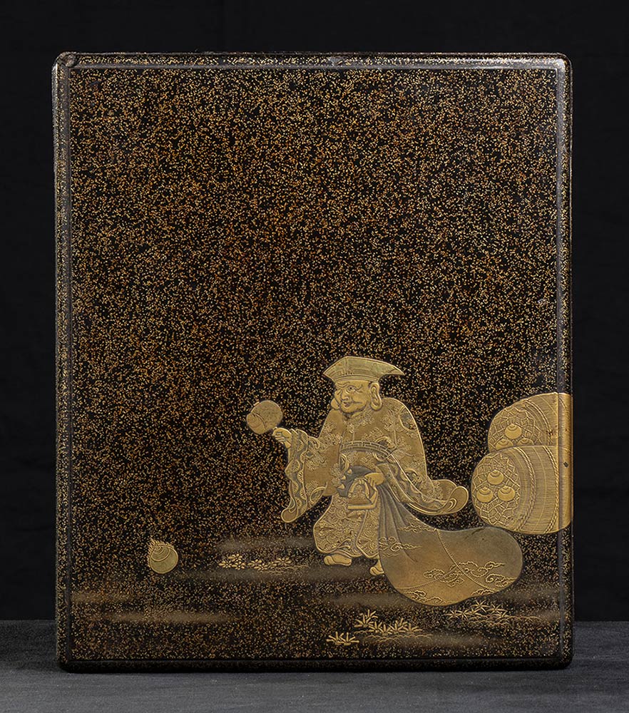 Priva degli scomparti interni, ha forma rettangolare con angoli leggermente stondati, l'intera superficie sia interna sia esterna è densamente spruzzata a oro 'a buccia di pera' (nashiji), l'esterno del coperchio presenta Daikoku con un martello e un sacco tra le mani, alle sue spalle due balle di riso e per terra un gioiello cintamani, questa decorazione finemente realizzata in hiramaki-e (“pittura spruzzata piatta”), l'interno del coperchio con un corso d'acqua stilizzata e intorno foglie sparse.