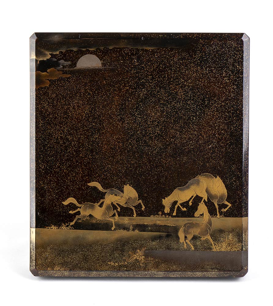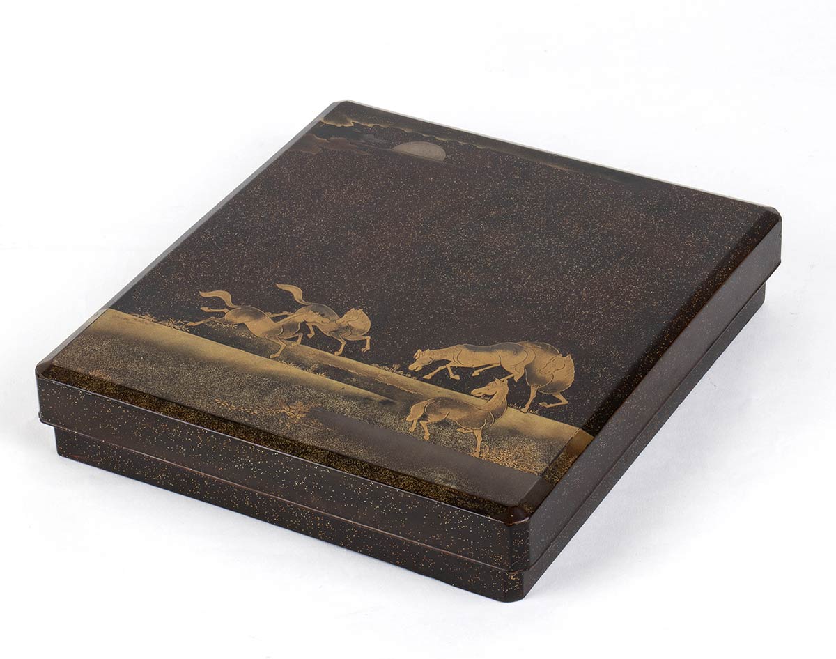 A sezione rettangolare, con gli angoli stondati, l'intera superficie sia interna sia esterna finemente decorata a oro e argento in maki-e su fondo 'a buccia di pera' (nashi-ji), l'esterno del coperchio con cinque cavalli nel paesaggio alla luce della luna parzialmente coperta dalle nuvole, l'interno del coperchio con un ciuffetto di erbe e fiorellini, è presente il vassoio rettangolare per i pennelli, l'alloggiamento per la pietra d'inchiostro e il dosatore d'acqua (suiteki), quest'ultimo in metallo e a forma di ventaglio con decoro di arabesco inciso.