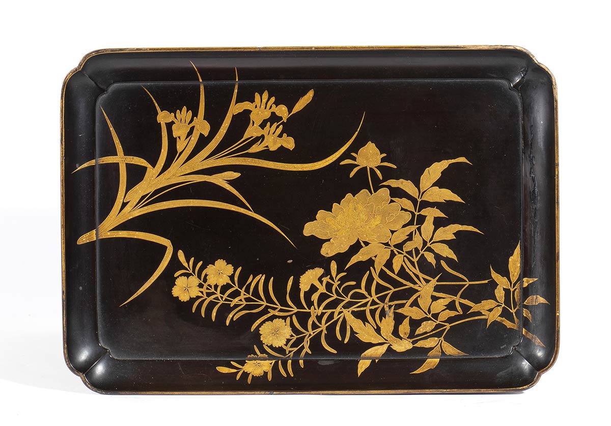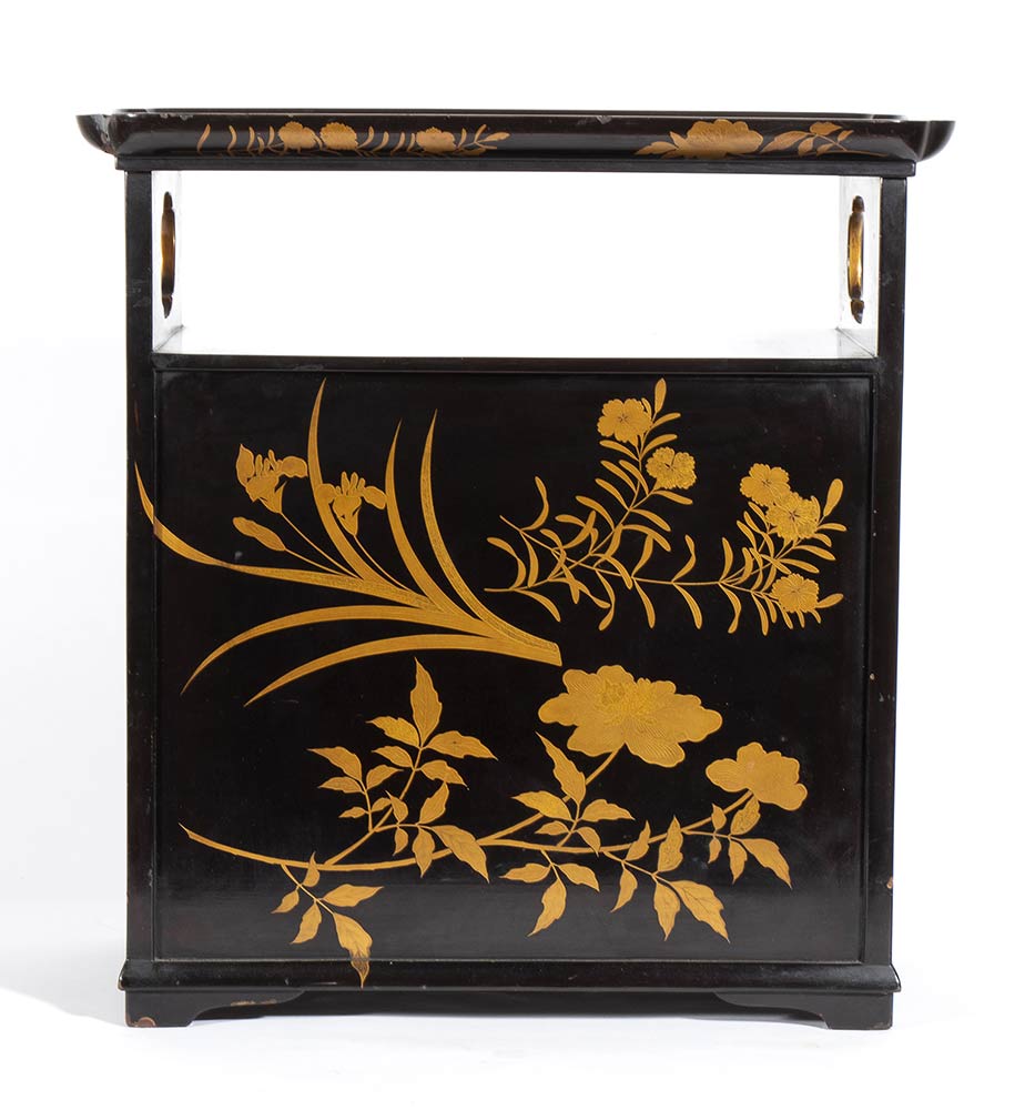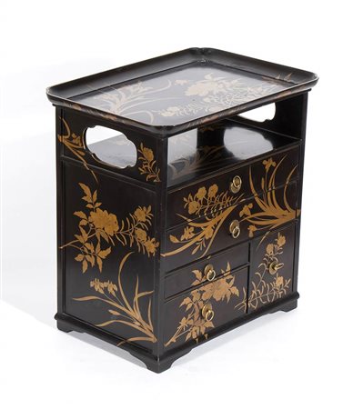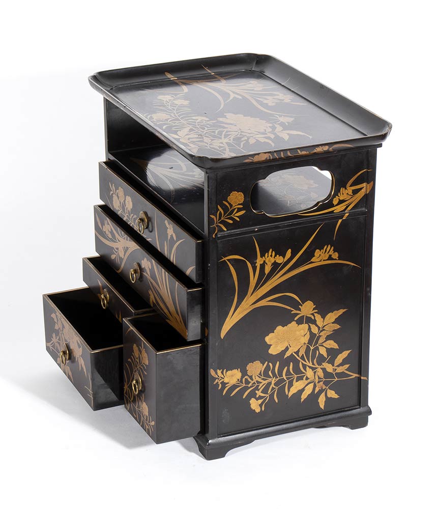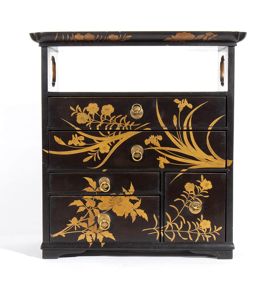 A sezione rettangolare, si compone di un lato superiore che funge anche da porta-oggetti e da cinque cassetti, due più grandi e tre più piccoli, sulla superficie esterna si spargono mazzetti di fiori a oro in hiramaki-e (“pittura cosparsa piatta”), le presine dei cassetti in metallo dorato con motivi floreali incisi.