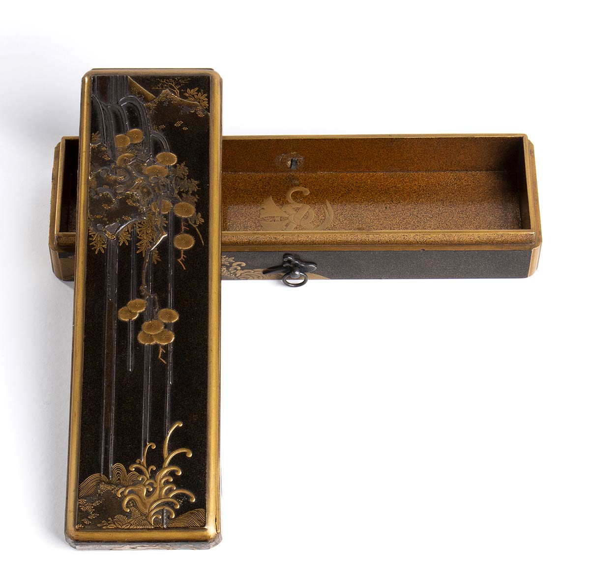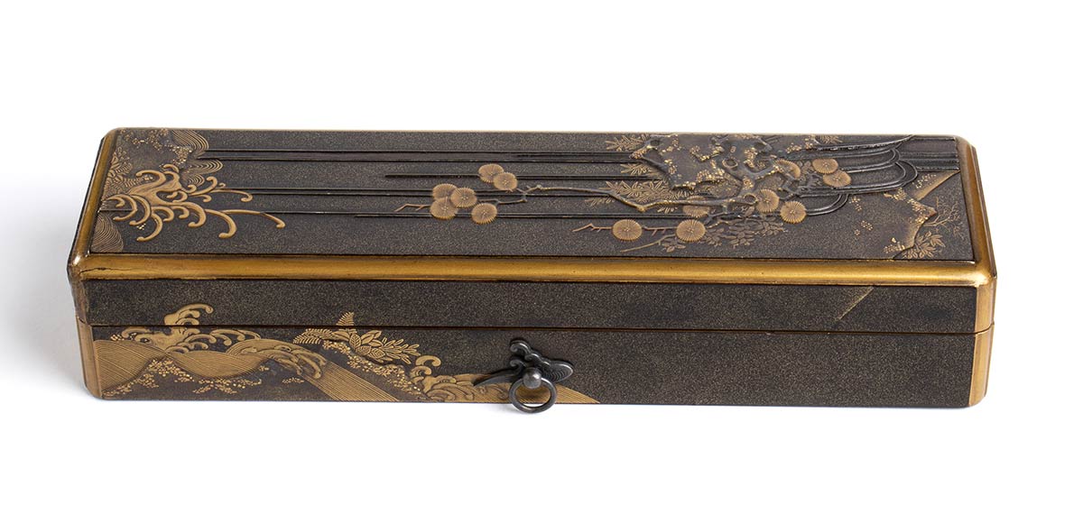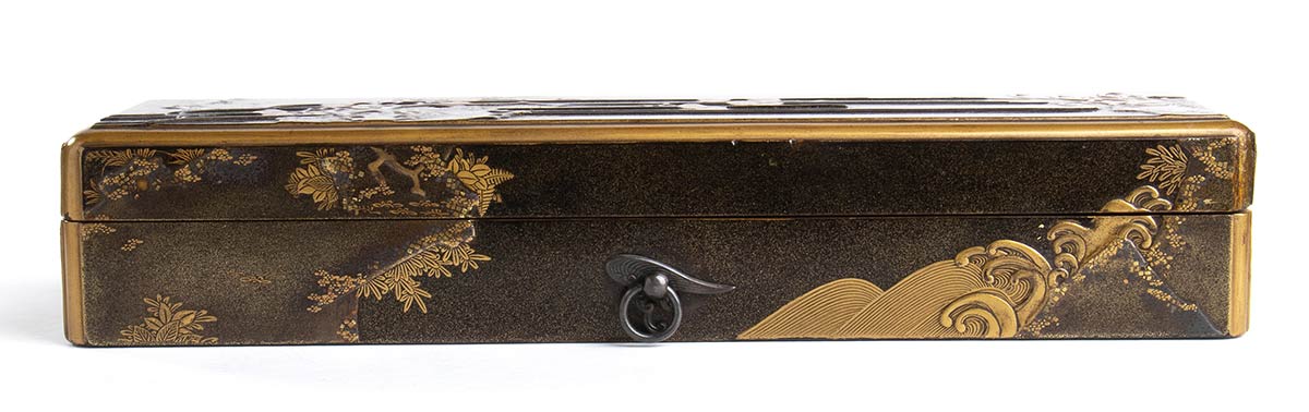 A sezione rettangolare e con gli angoli stondati, presenta sull'esterno una decorazione a oro e argento in alto rilievo (takamaki-e) e frammenti di foglia d'oro (kirikane) con tronchi di pino tra scrosci e flutti di cascata, l'interno del contenitore e del coperchio con un fondo 'a buccia di pera' (nashiji) sul quale si sovrappongono mazzetti di fiori e griglie in hiramaki-e (“pittura cosparsa piatta”).