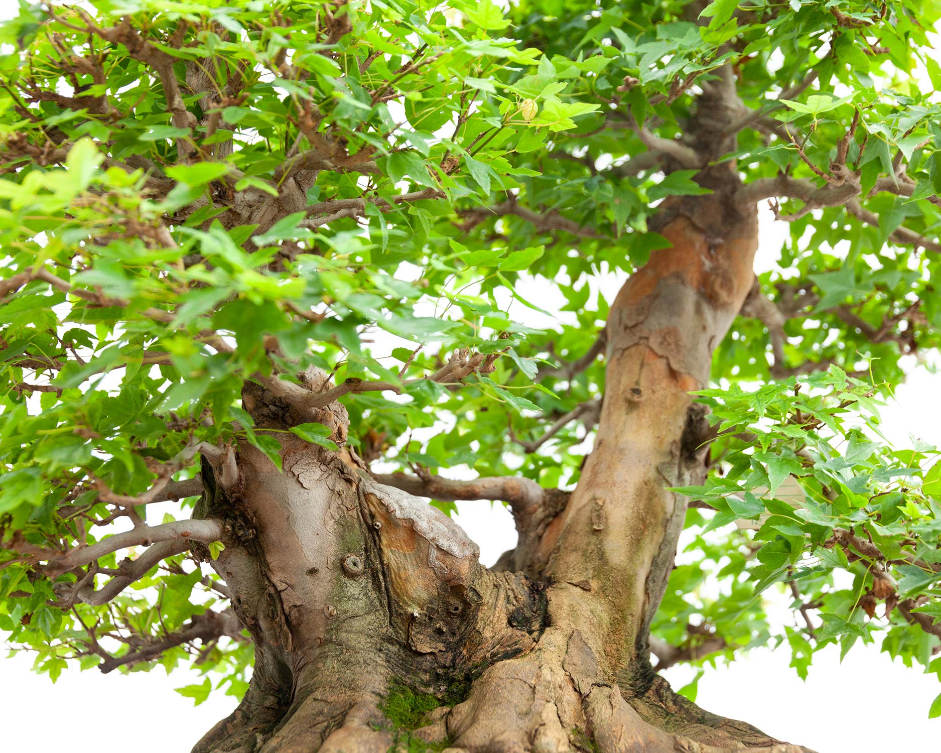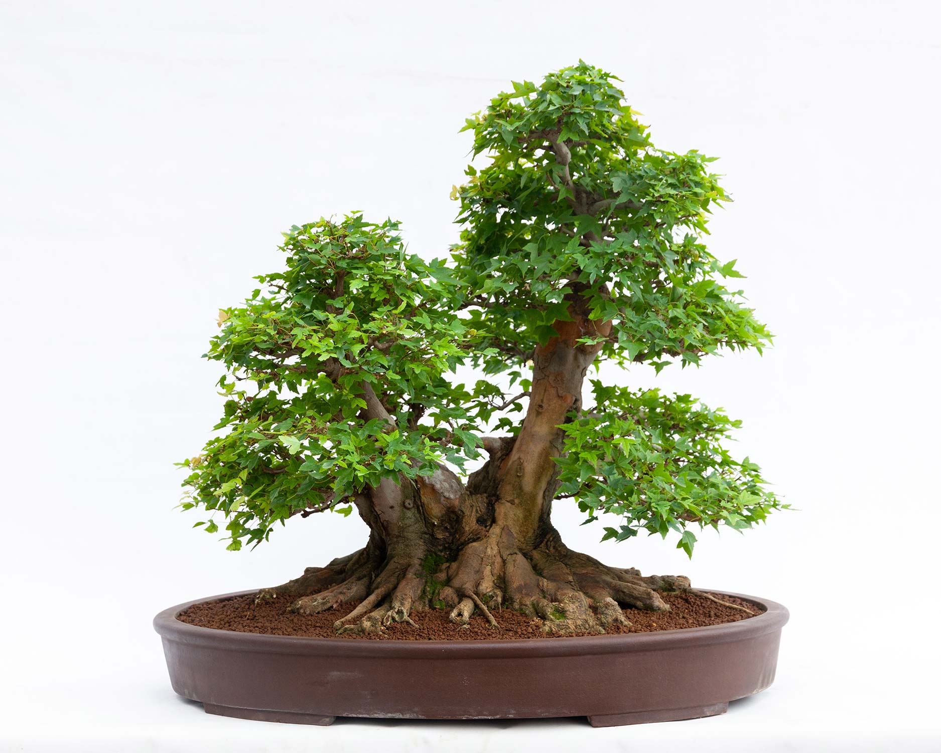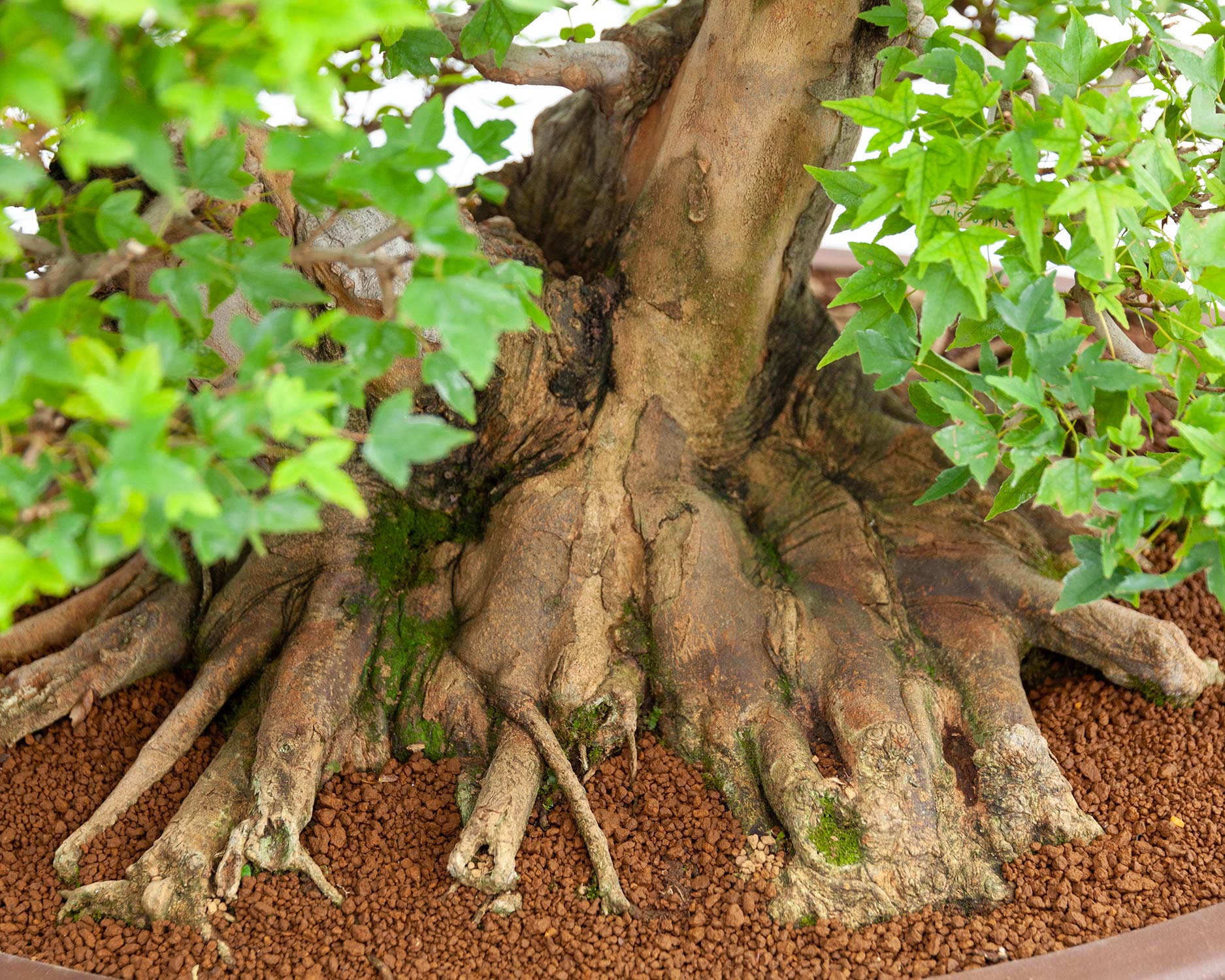 Impressionante bonsai dal nebari molto imponente da cui si sviluppa la struttura a doppio tronco. Coltivato in Giappone dal maestro Mori. Età stimata 90 anni.
