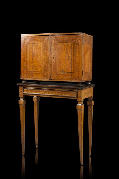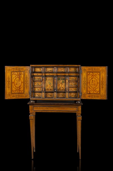 Monetierie intagliato e intarsiato in legni vari con scene di caccia e profilato in legno ebanizzato. Due sportelli rivelano due ante tra cariatidi sormontate da maschere, cassettini, segreti e coperchio nella parte superiore. Piedi a cipolla. Germania, secolo XVII. Sostegno di epoca posteriore, cassetto nella fascia, gambe ad obelisco rovesciato (stipo cm 60x79x40, sostegno cm 90x86,5x45) (difetti)