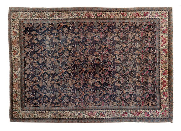 Decoro all-over con rami fioriti, rose qajar ed uccellini in policromia su fondo blu notte. Bordura floreale a fondo bianco. (cm 400x310) (difetti e piccole rapature)