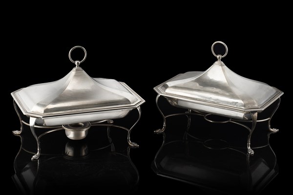 Coppia di scaldavivande in argento a corpo liscio, montanti mossi con piedini a