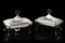 Coppia di scaldavivande in argento a corpo liscio, montanti mossi con piedini a ricciolo. Presa del coperchio ad anello. Londra, 1818. Argentiere S.P. (cm 30x24x21) (g 3500) (segni d'usura, mancanze)