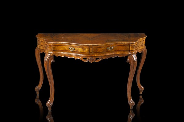 Tavolo da parete di forma mossa lastronato, intagliato e filettato in noce, due cassetti sottopiano, gambe sagomate. Venezia, secolo XVIII (cm 140x82x62) (difetti)