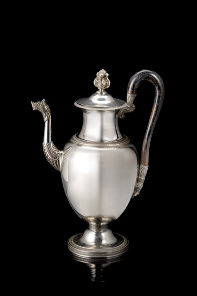 Caffettiera in argento con corpo ovoidale liscio, decorato da cinture godronate, versatoio zoomorfo, ansa in legno ebanizzato con attacco a volto muliebre, pomolo a bocciolo. Vienna, 1834, possibile argentiere Friedrich Wayard (h. cm 31 ca.) (g 980 ca.) (lievi difetti)