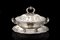 Zuppiera biansata con vassoio in argento. Presa del coperchio ad anello decorat