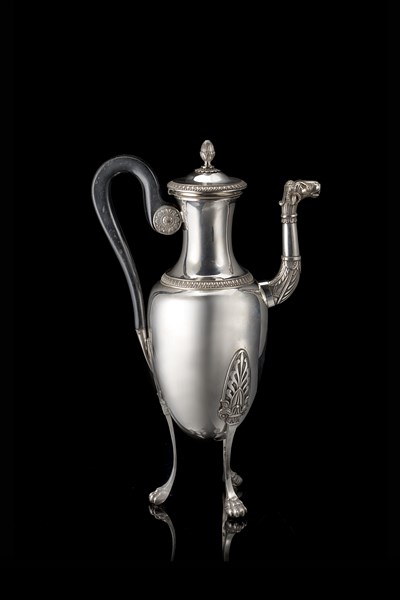 Caffettiera tripode in argento con corpo ovoidale decorato da cinture godronate e stemma inciso, versatoio zoomorfo, piedi ferini con attacchi ad anthemion, pomolo a ghianda, ansa in legno ebanizzato. Francia, 1819-38. Argentiere JWM (h. cm 33) (g 990 ca.) (lievi difetti)