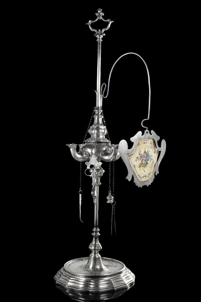 Lampada fiorentina in argento con fusto liscio poggiante su base circolare sagomata incisa a stemma. Contenitore porta olio con quattro bocche e accessori con catene. Stato Pontificio, secolo XIX. Argentiere non identificato (h. cm 78) (g 2740 lordi) (difetti)