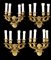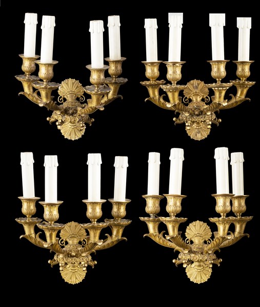 Gruppo di quattro appliques a quattro fiamme in bronzo, portacandele sorretti d