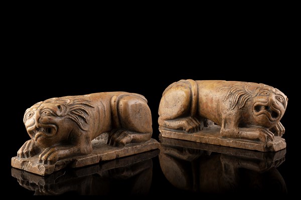 Coppia di antiche sculture in marmo rosso raffiguranti leoni accovacciati (l. c