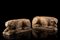 Coppia di antiche sculture in marmo rosso raffiguranti leoni accovacciati (l. cm 30) (difetti e mancanze)
