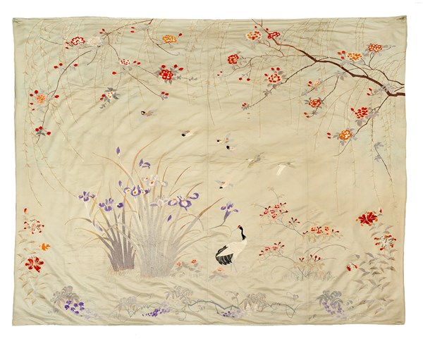 Ricamo in seta policroma su fondo in raso di seta color thè verde raffigurante cicogne in un laghetto con iris e fiori di pesco. Cina, fine secolo XIX (cm 220x235) (difetti)