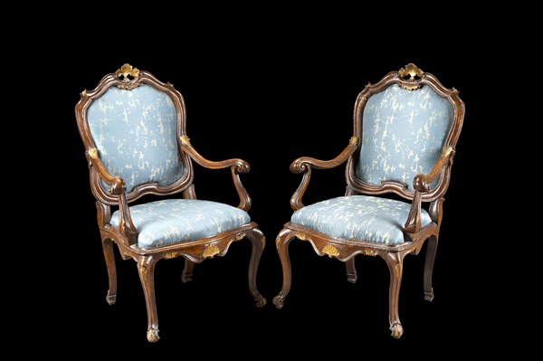 Coppia di poltrone in noce con schienale e braccioli sagomati, decorate con fregi dorati, gambe mosse. Venezia, secolo XVIII (difetti)