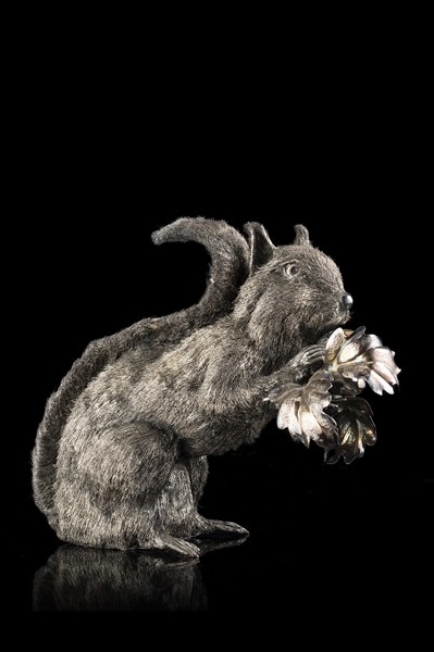 "Scoiattolo con ghiande" scultura con lavorazione a pelo in sottili fili d'argento. Titolo 925. Firmata e inscritta "Italy" alla base (h. cm 18)