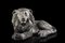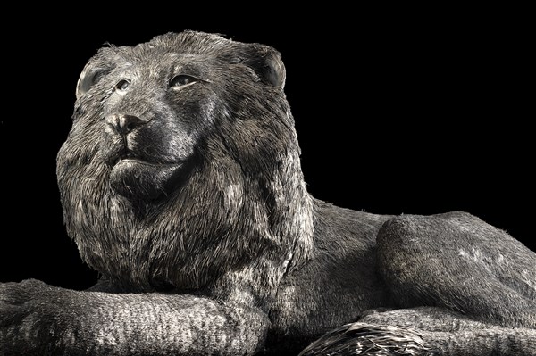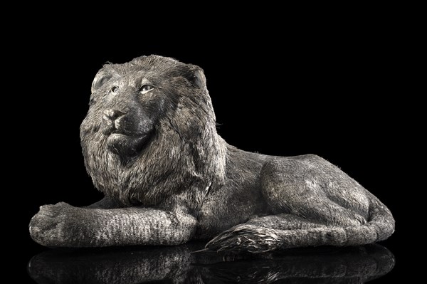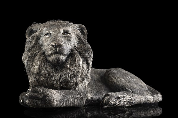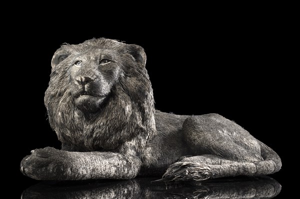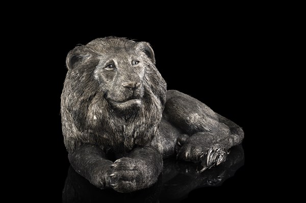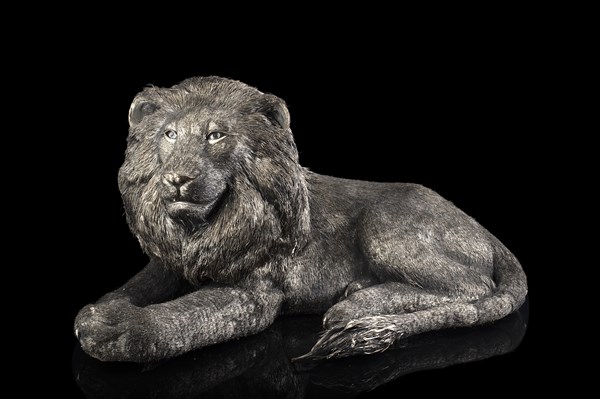 "Leone accovacciato" scultura con lavorazione a pelo in sottili fili d'argento. Titolo 925. Firmata e inscritta "Italy" alla base (cm 60x32)