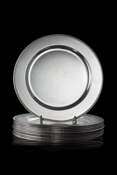 Gruppo di dodici sottopiatti in argento di forma tonda a bordo cordonato. Titolo 800 (d. cm 29,7) (g 6500)