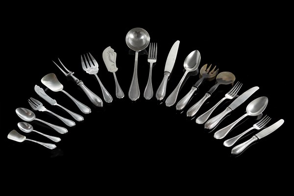 A silver flatware service comprising: twelve forks, spoons and knieves, twelve little forks, twelve little knieves and twelve little spoons, twelve fish forks and twelve fish knieves, twelve little spoons, twelve ice cream scoops and ten serving cutlery. Titled 800. Early 20th century. Not identified silversmith (g 5930) With case