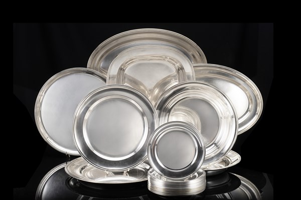 Parte di servizio in argento liscio con bordo scanalato, composto da ventiquattro piatti da dolce e nove piatti da portata di diversa forma. Titolo 800. Padova, seconda metà secolo XX. Argentiere Fratelli Zaramella (g 11600 ca.) (lievi difetti)