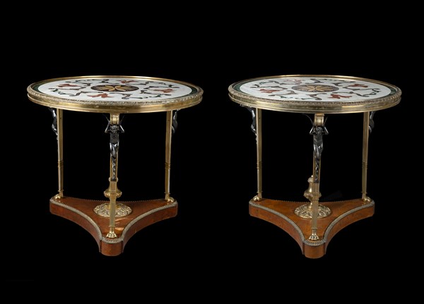 Coppia di tavoli con piani intarsiati in marmi vari a volute e centrati da rosone. Montanti in bronzo, decorati da figure femminili alate e poggianti su piano lastronato e decorato da ringhiera in bronzo e da pinnacolo al centro (h. cm 84 x d. cm 98) (difetti e mancanze)