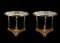Coppia di tavoli con piani intarsiati in marmi vari a volute e centrati da roso