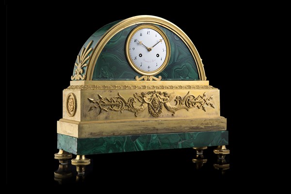 TAVERNIER A PARIS Pendola da camino con cassa di forma arcuata in malachite e b