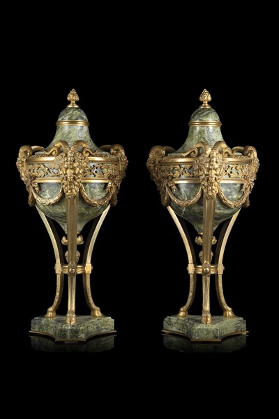 Coppia di elementi decorativi in marmo verde in forma di vasi con pinnacolo a pigna e montanti in bronzo a mascheroni, riuniti da festoni e terminanti a piedi caprini. Base sagomata (h. cm 39) (lievi difetti)