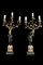 Coppia di candelieri a tre fiamme con braccia in bronzo decorate a fiori e foglie poggianti su cornucopia sorretta da sculture a tutto tondo di mori in bronzo brunito. Base a plinto in alabastro e marmo grigio con ghiere e festoni in metallo. Secolo XIX (h. cm 67) (difetti)