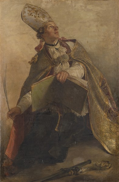 Scuola emiliana della fine del secolo XVIII Santo vescovo Olio su tela, cm 176