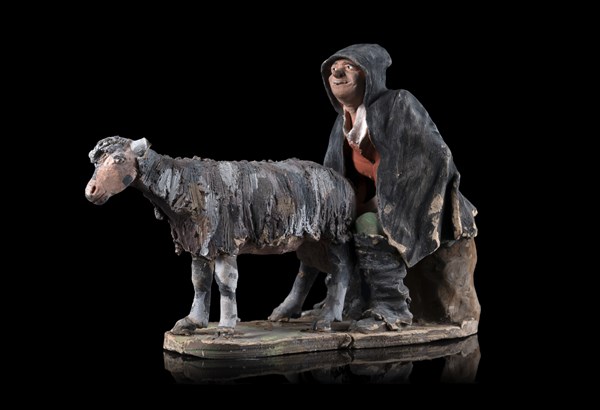 Arte del secolo XIX "Mungitore e capra" gruppo in terracotta policroma. Attribu